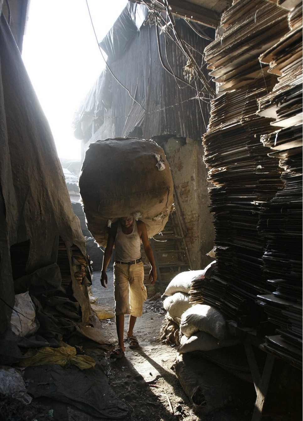 - Un joven reciclador de plástico en una de las etapas del proceso, en pleno Dharavi.