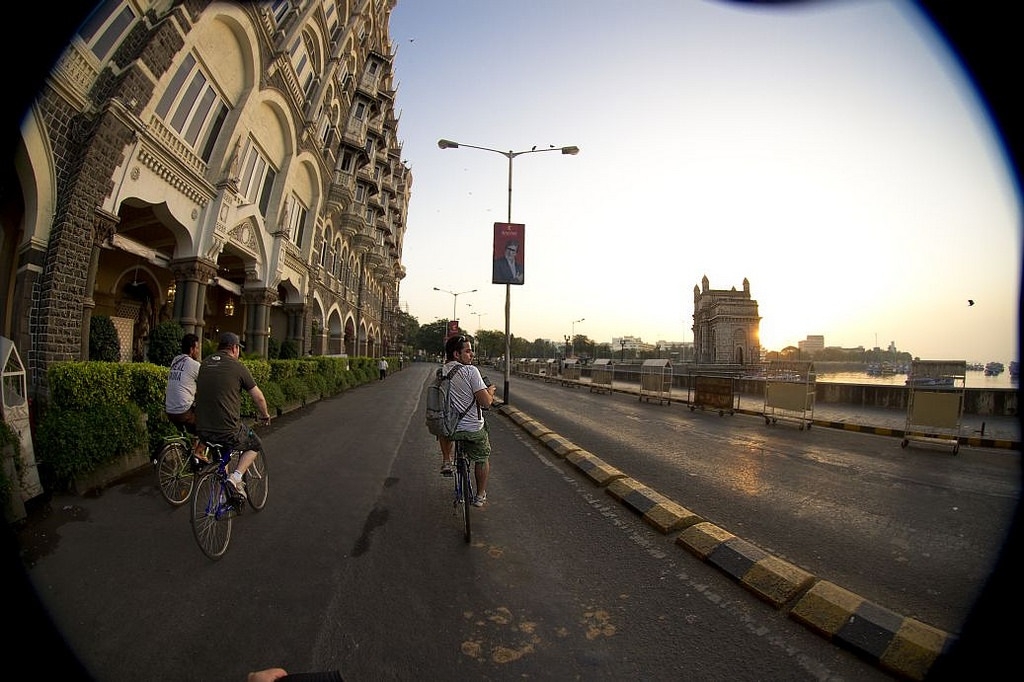 - El lente de la cámara capta el gran hotel Taj Mahal Palace de Bombay y la puerta de la India a la derecha.